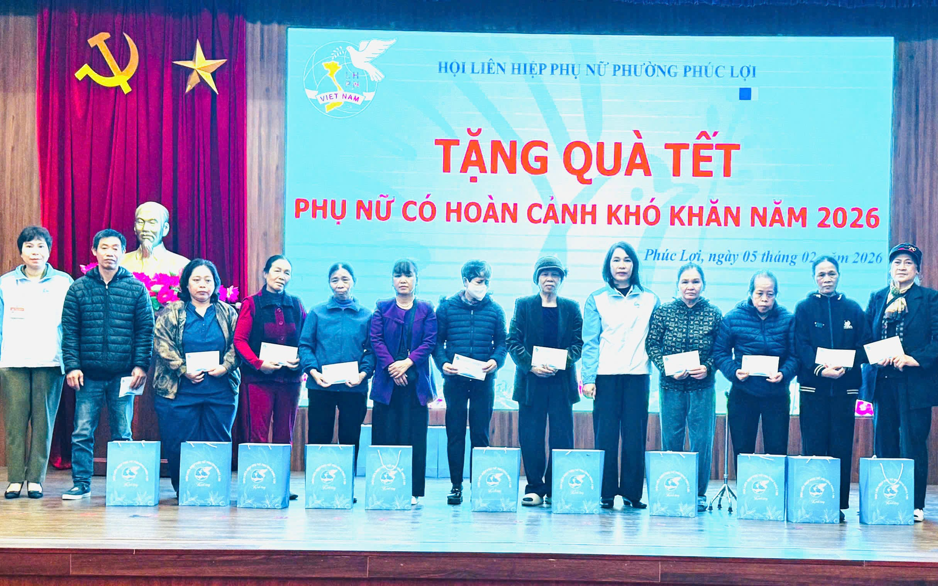 Nhân dịp Tết Nguyên đán xuân Bính Ngọ 2026 các cấp Hội phụ nữ phường Phúc Lợi đã hưởng ứng hoạt động "Tết yêu thương" do Trung ương Hội phát động và thực hiện sự chỉ đạo của Chính phủ "Không để ai bị bỏ lại phía sau" các cấp Hội phụ nữ trong toàn phường đã thăm hỏi tặng 237 suất quà cho phụ nữ mắc bệnh hiểm nghèo, hội viên có hoàn cảnh khó khăn và trẻ em mồ côi, mắc bệnh hiểm nghèo, có hoàn cảnh khó khăn đặc biệt trên địa bàn với tổng số tiền 113,1 triệu đồng từ nguồn vận động các mạnh thường quân và nguồn lực của Hội (trong đó có 105 suất quà, trị giá 73,5 triệu đồng do Hội LHPN phường tặng và 132 suất quà, trị giá 39,6 triệu đồng do các chi hội phụ nữ tặng).